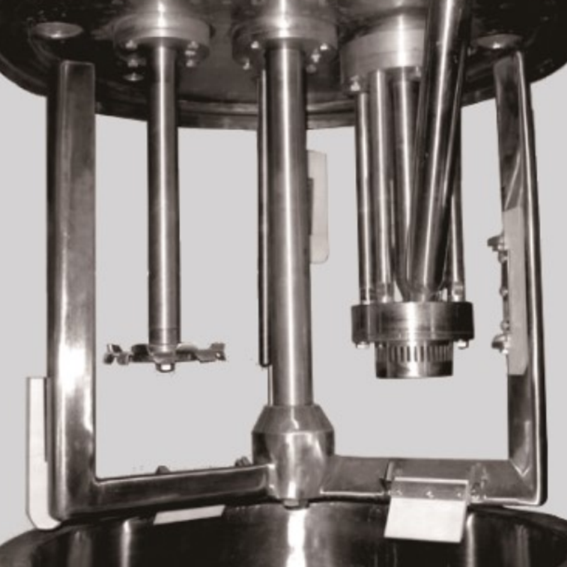 为了改善投料的方便,我们在常规多功能混合机的基础上进行了创新改进,可以在真空盖不打开的前提下进行粉料的加入。在正常工作状态下利用高剪切乳化转子的高速产生虹吸效果将粉料或液体料直接吸入搅拌的物料中去。避免了开盖加料造成的粉尘飞扬与污染。对产品要求极高的电子材料应用是不错的选择。